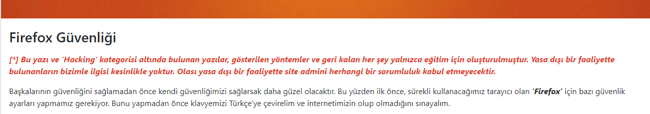 Yani benim burada yazdığım her şey tamamen benim sorumluluğumda. Ben, Hacking kategorisi için şu ana kadar başlangıç seviyesinde, zararı olmayan içerikleri koydum; daha çok gizlilik ile ilgiliydi. Sizin de bildiğiniz üzere bu kategoride ağ saldırılarından tutun bambaşka saldırılara kadar birçok saldırıyı anlatıp uygulayacaktım. Ancak bütün bunları eğitim amaçlı yapacaktım; "bir şeyin nasıl bozulduğunu bilmiyorsan onu koruyamazsın" mottosu hakimdi. Bunun için Hacking içerisindeki her blogun başına ve sonuna kırmızı renkte olan şu uyarıyı koydum.