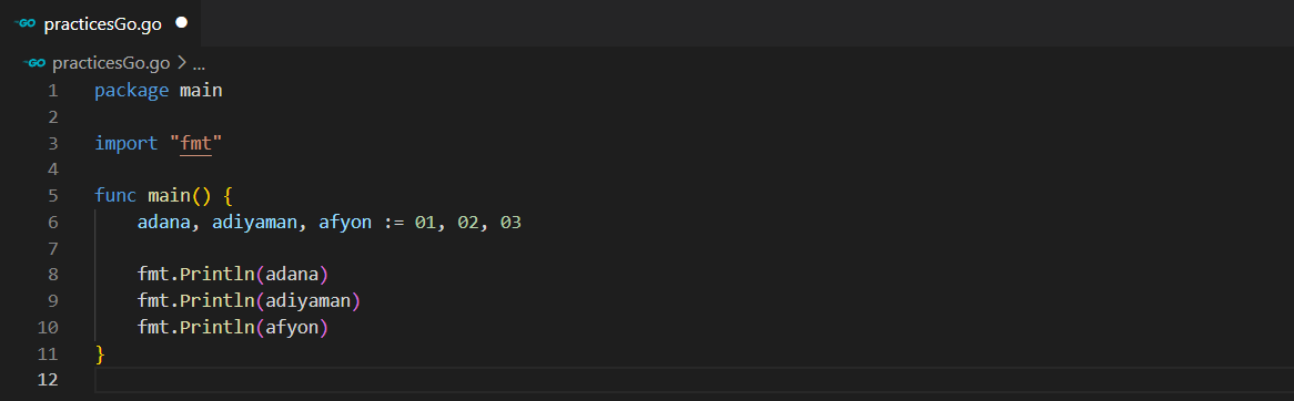 Son olarak bir süslü parantez açıp elemanlarımızı giriyoruz. Bunu yaparken her elemanı birbirinden virgül ile ayırıyoruz; unutmayalım. Kodumuzun son hâli: 'iller := [3]string{"adana", "adıyaman", "afyon"}'