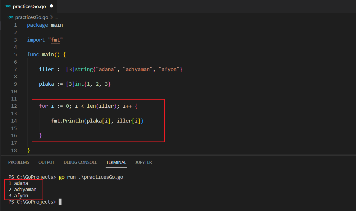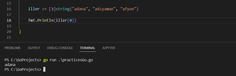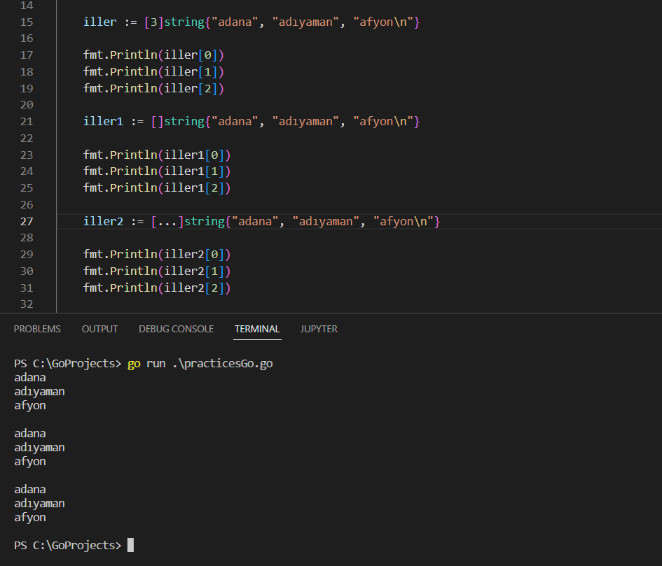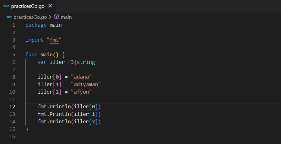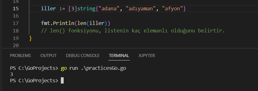 Bunu yaptıktan sonra listenin veri tipini belirtmek zorundayız. Bu belirtmeyi herhangi bir boşluk olmadan yapmak zorundayız ve lütfen unutmayın: "veri tipini ne olarak belirtirseniz elemanları da o tipte yazmak zorundasınız." Kodumuzun son hâli: 'iller := [3]string'