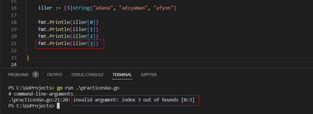 Kırmızı kutu içerisine bakalım. 'iller[3]' şeklinde bir şey yazmışız. Normal şartlarda bu komutun bize, listedeki son elemanı vermesini bekleriz ama gördüğünüz gibi hata aldık. Go bize, 'üçüncü indekste bir şey tanımlı değil/üçüncü indeks sınırlar dışında' şeklinde bir mesaj veriyor. İşte, indeks mantığı ve listeden eleman çağırma mantığı tam olarak bu şekildedir.