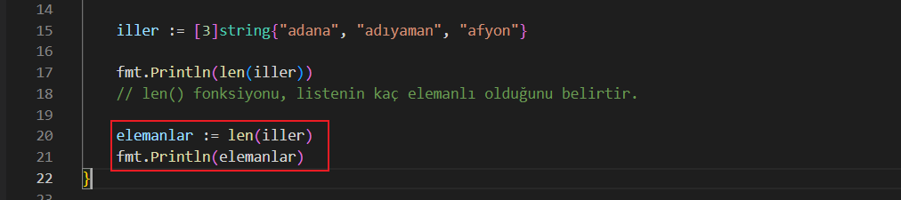 elemanlar değişkenine len(iller) diyerek iller listesinin uzunluğunu yani kaç elemanlı olduğunu atadık. Daha sonra fonksiyonları iç içe yazmak yerine sade bir şekilde fmt.Println(elemanlar) şeklinde yazdık.