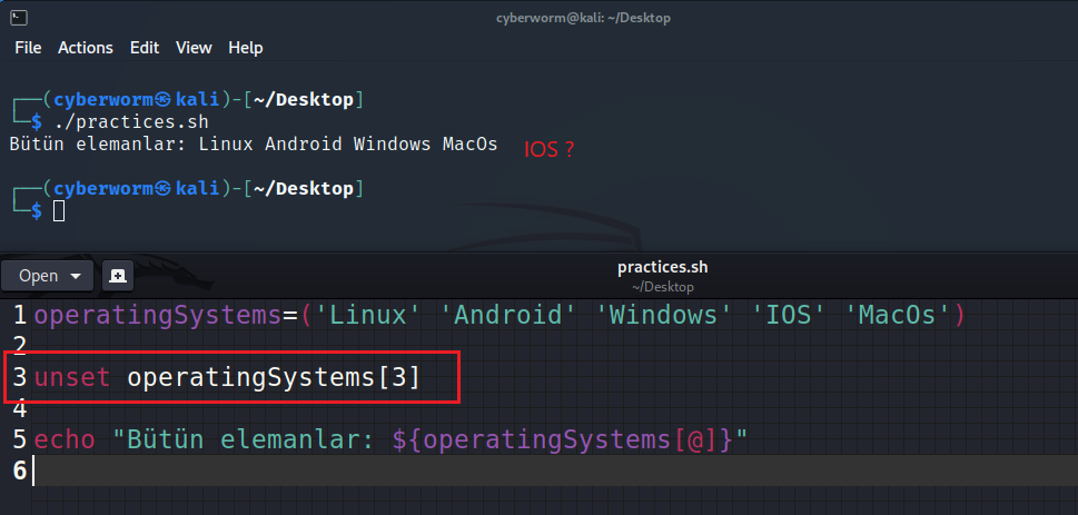 Burada 'unset' komutunu kullandık ve sade değişkenimizin başına ne dolar işareti koyduk ne de kendisini bir şeye eşitledik. Sadece köşeli parantezler arasına çıkarmak istediğimiz elemanın index numarasını verdik ve işlem tamamlanmış oldu.