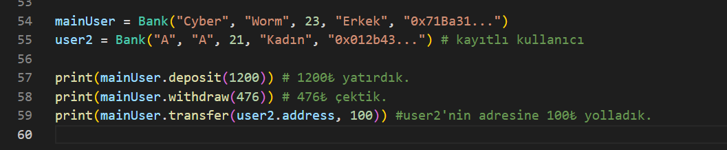 Son olarak print(mainUser.transfer()) derken mainUser yani self için transfer metodunu çağırmasını istedik. print(mainUser.transfer(user2.address, 100)) derken ise, user2 isimli nesnenin address isimli özelliğini kastederek ona 100 birim para yolluyoruz. Burada user2 dediğimiz şey aslında transfer metodundaki receiver, 100 sayısı ise amount oluyor.
