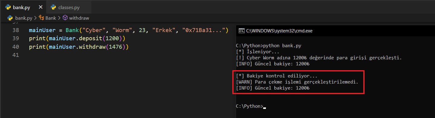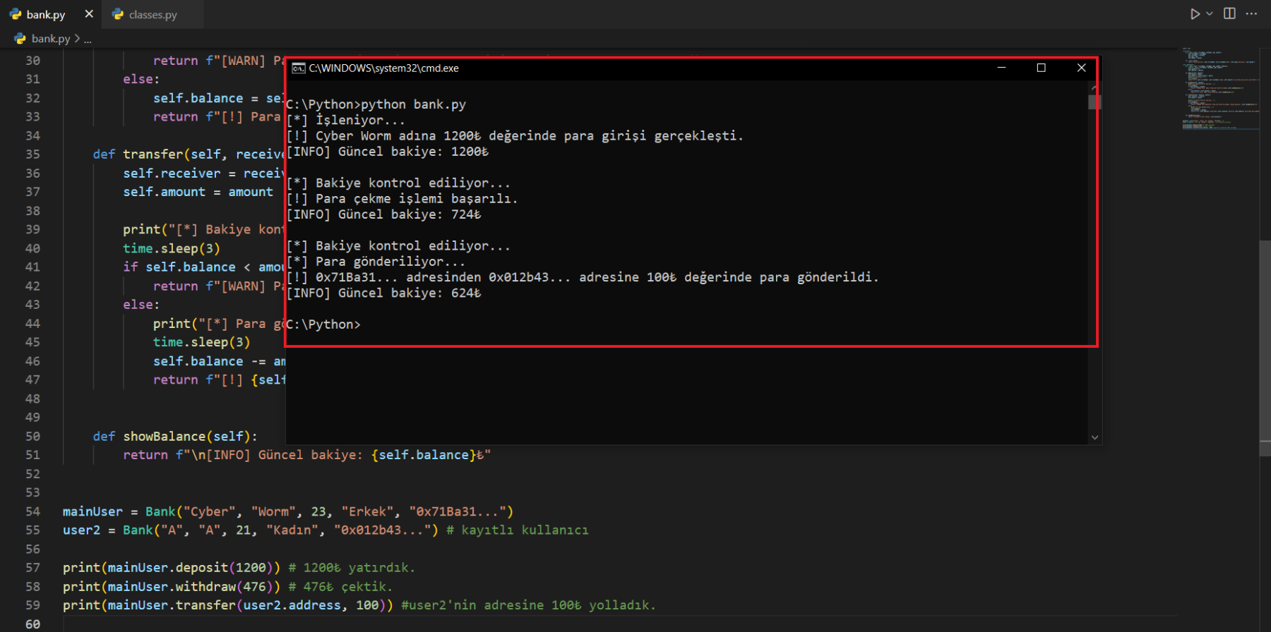 Sonrasında bu işlemin gerçekleştiğini belirtiyorum ve time.sleep(3) diyerek 3 saniye bekliyorum. 3 saniye dolduğunda ise bir return gerçekleştiriyorum. Burada şu tarz bir çıktı gelecektir: "Cyber Worm adına 1200₺ değerinde para girişi gerçekleşti. [INFO] Günce Bakiye: 1200₺".