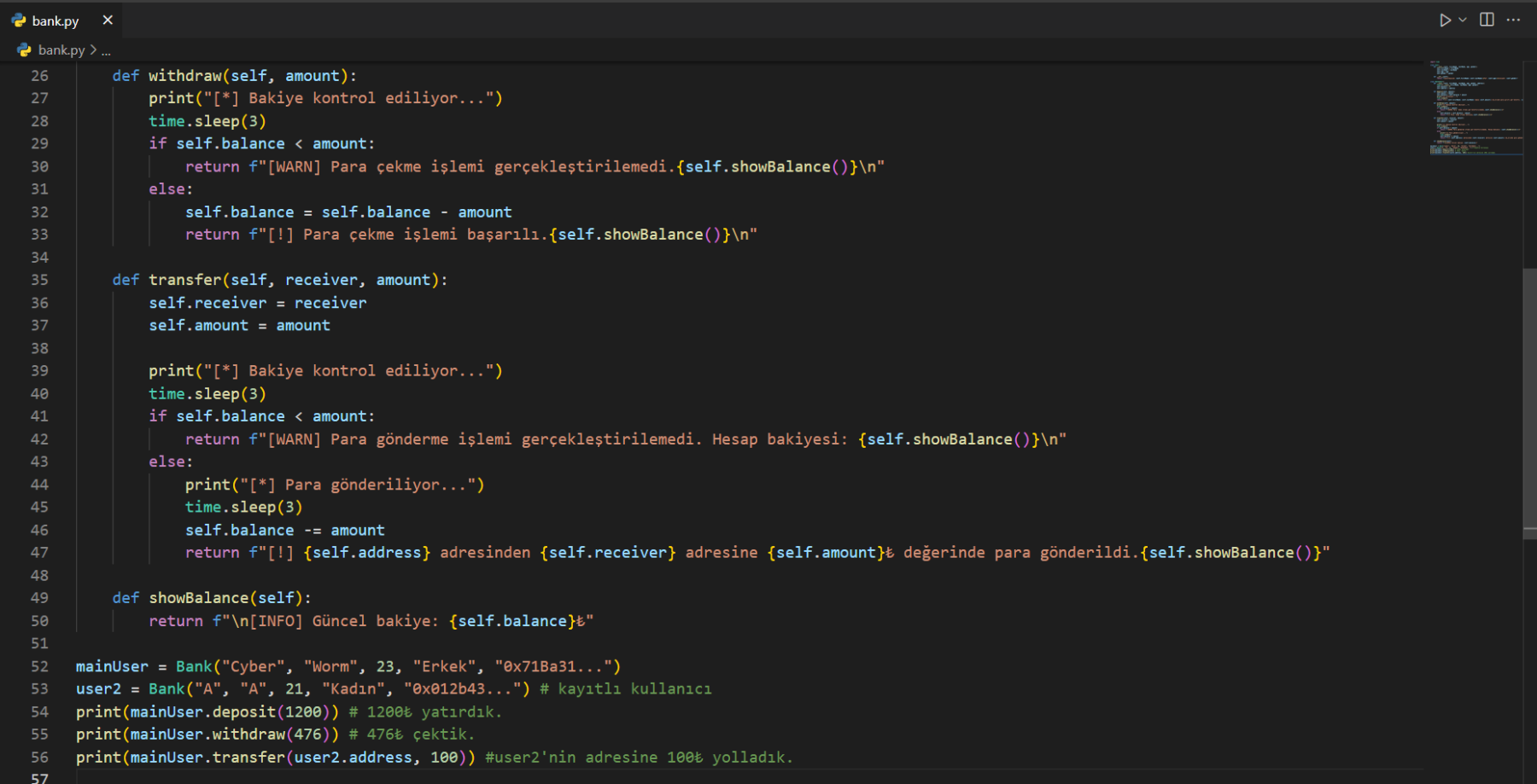 mainUser = Bank(...) şeklinde bir nesne tanımladım ve en sona bir adres koydum. Bu adresi birazdan kullanacağız. Elbette, normal bir IBAN yerine örnek bir kripto para cüzdan adresi koydum.