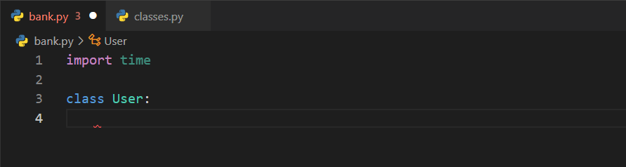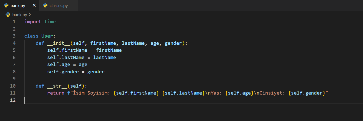 Bunun için her şeyden önce time kütüphanesini import ediyorum çünkü işlemler arası bekleme süresi belirleyeceğim. Hemen sonrasında User isimli bir class oluşturuyorum.