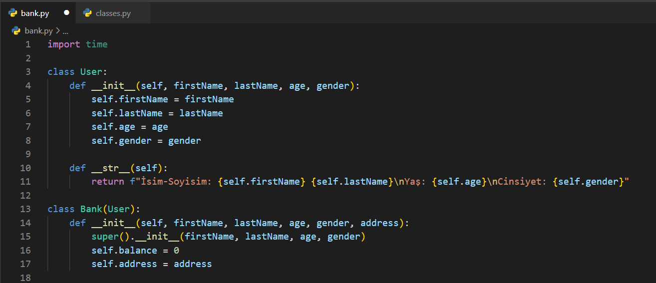 Hemen sonrasında yine bir __init__ tanımlayıp address isimli yeni bir özellik tanımlıyorum. Bildiğiniz gibi super() metodunu da kullanarak User isimli sınıftaki özellikleri çekiyorum.