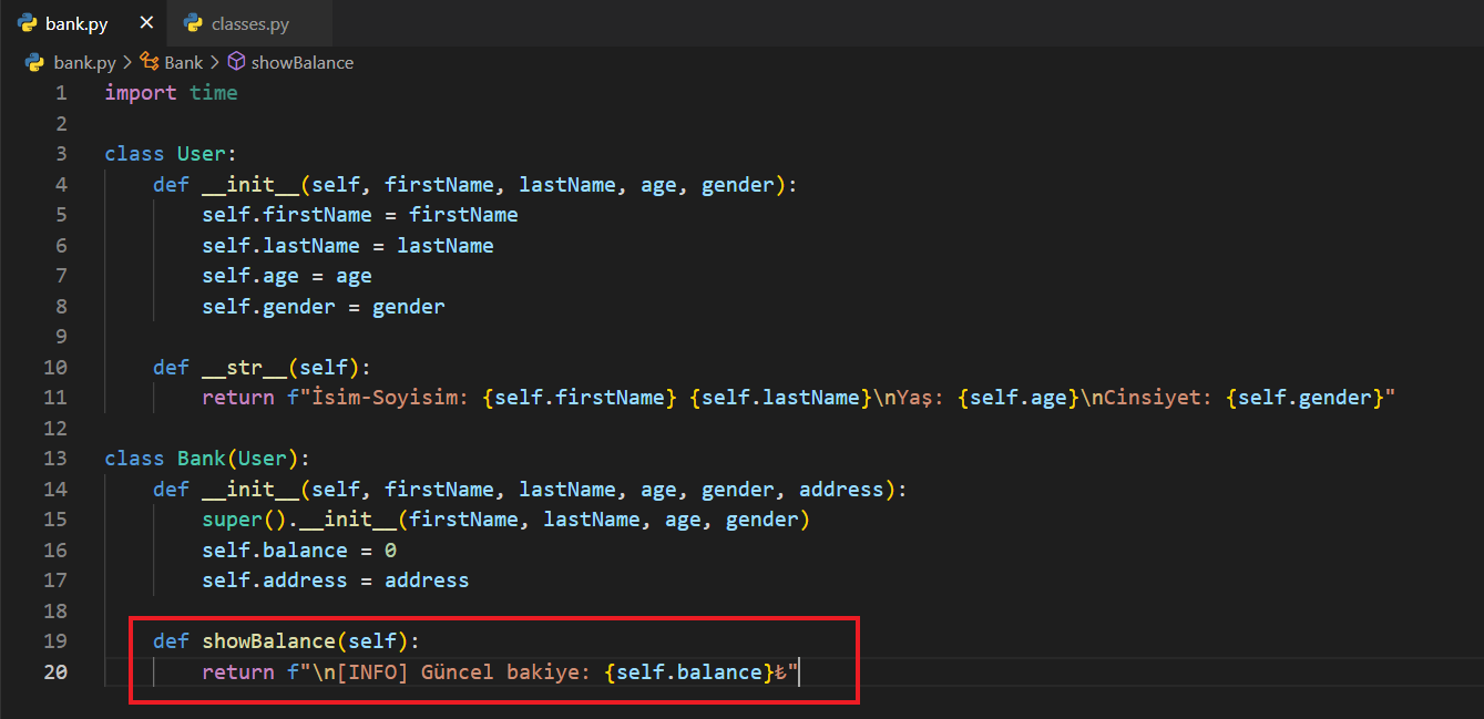 En sonda, biraz önce tanımladığımız showBalance(self): metodunu koyuyorum ve bunun güncel kalmasını sağlıyorum. Ayrıca bunu yaparak oldukça esnek bir hareket alanım oluyor. Çünkü metodun içini istediğim şekilde düzenleyebilirim.