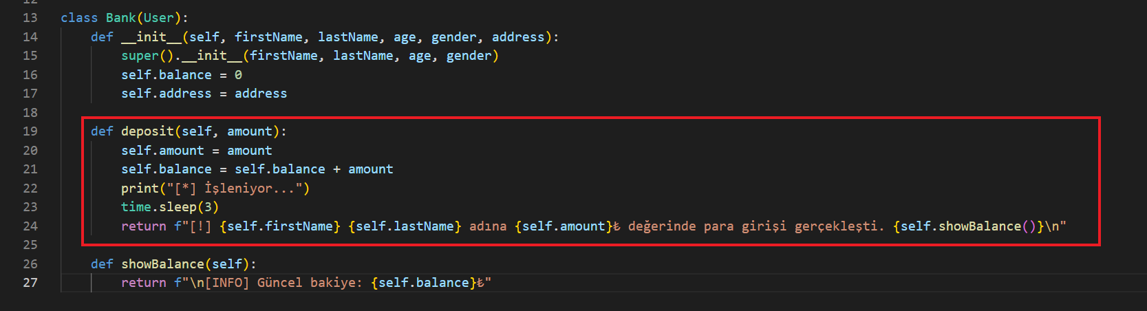 Sonrasında print(mainUser.deposit(1200)) kodunu yazdım. Bu noktada deposit yani para yatırma metodunu mainUser için çalıştırıyorum. İçerisine verdiğim 1200 değeri ise, metodu tanımlarken verdiğimiz amount argümanından kaynaklanıyor. Bu kod ile ben, hesabıma 1200₺ yatırdım.