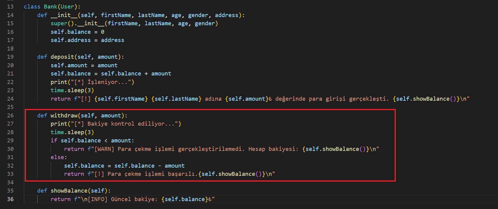 Bunun için withdraw isimli bir metot oluşturup içerisine self ve amount argümanlarını veriyorum. Hemen sonrasında işlemin gerçekleşebilmesi için gereken şartı koyuyorum. Bu noktada para çekebilmek için hesapta, çekilmek istenen tutar kadar bir para olması gerekiyor. Bu yüzden oraya if self.balance < amount: şeklinde bir koşul verdim ve içerisine "Başarısız" tarzında bir return koydum. Çünkü eğer balance değeri yani hesaptaki para, amount değerinden yani çekilecek olan tutardan daha az ise para çekemeyiz.