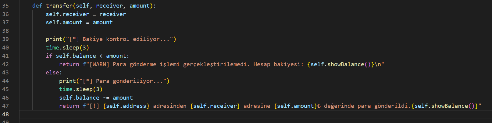 def transfer(self, receiver, amount): şeklinde, self dışında iki argüman alan bir metot tanımladım. Bu metotlardan receiver, alıcı kişiyi ifade ederken amount, yollanacak parayı ifade ediyor. Sonrasında bunları self.receiver = receiver şeklinde tanımlıyorum ve aşağı iniyorum.
