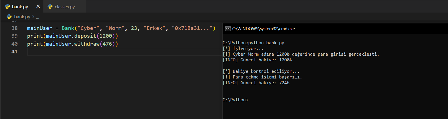 Şimdi, bir instance daha oluşturalım ve sırasıyla para yatırma, para çekme ve para transferi işlemlerini gerçekleştirelim.