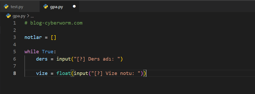 Döngü içerisinde, iki adet girdi beklediğimi görüyorsunuz. Bunlardan biri 'ders' iken diğeri 'vize' şeklinde. Peki, bir önceki uygulamada yapmadığım 'ders ismi isteme işini' burada neden yapıyorum? Size, bilgileri 'notlar' isimli listede tutacağımı söylemiştim. Sadece notları tutarsak hangi notun hangi derse ait olduğunu bilemeyeceğiz. Bu yüzden bunları eşleştirip ekleme işlemini yapacağım. Zaten kullanıcıdan sürekli girdi alacağımız için sürekli ders ismi ve not girecektir. Örneğin 'matematik:100' şeklinde.