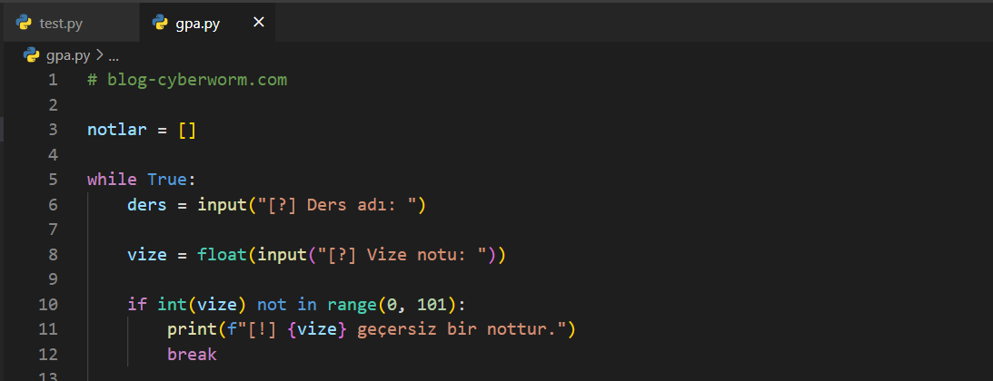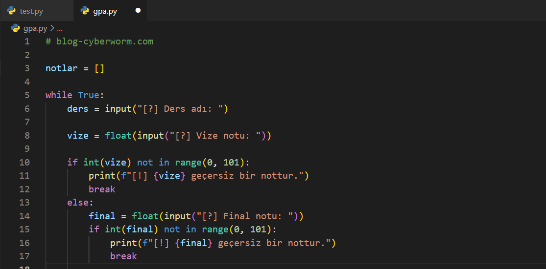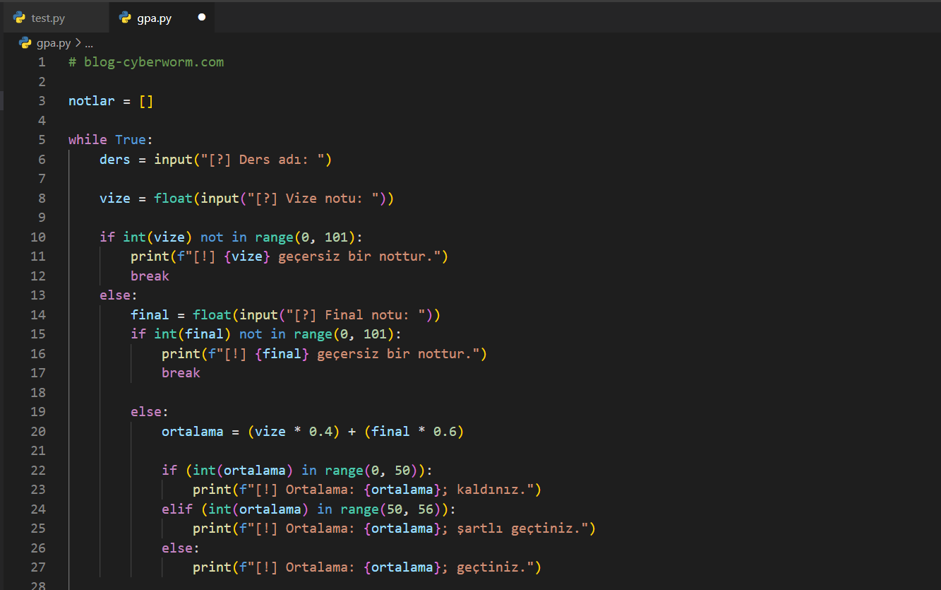 Birkaç blog öncesinde 'Uygulama | Ders Ortalaması Hesaplama' isimli bir uygulama yapmıştık ve bu uygulamada sınırlı becerilere sahiptik. Örneğin kullanıcıdan sürekli olarak girdi alamıyor, her şeyi if - elif - else ile halletmeye çalışıyorduk. Artık bizim, daha kaliteli işler çıkarmamız gerekiyor. Bu uygulamada, bahsettiğim uygulamayı geliştirmeye çalışacağız ve size belli ödevler vereceğim. Bununla beraber 'in' ve 'not in' komutlarının ne kadar işlevsel olduğunu göstereceğim. Başlayalım.