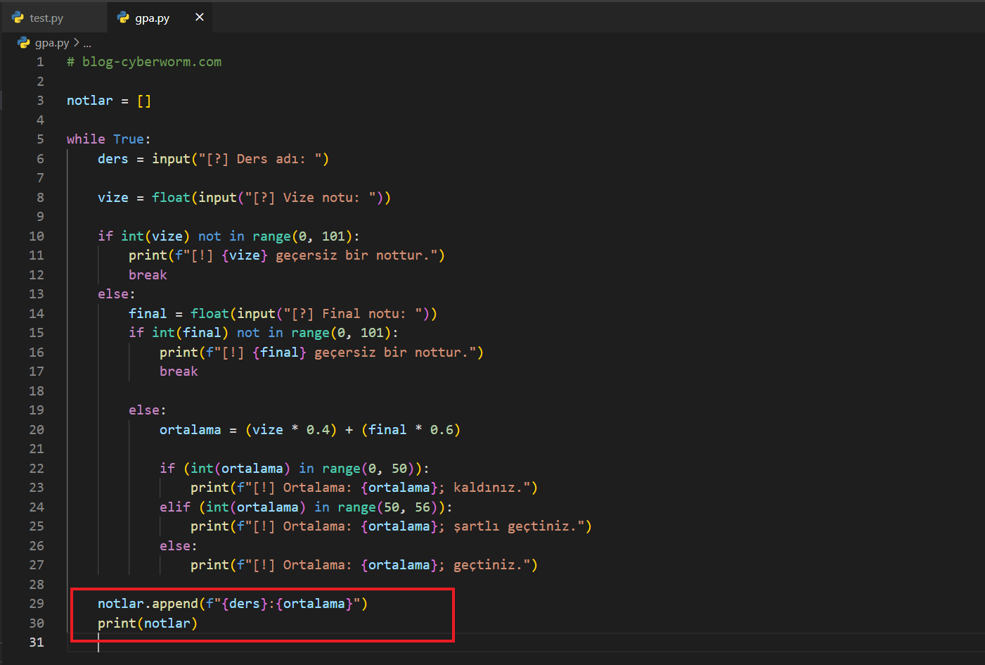 Hesaplamalar ve geçme-kalma durumunu hallettiğimize göre yazının başında tanımladığımız boş listeyi ele alabiliriz. Şimdi biz, kullanıcının girdiği ders ismini ve o dersin ortalamasını listeye eleman olarak ekleyeceğiz. Bunun için append() fonksiyonunu kullanıyorduk.