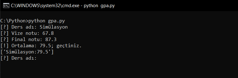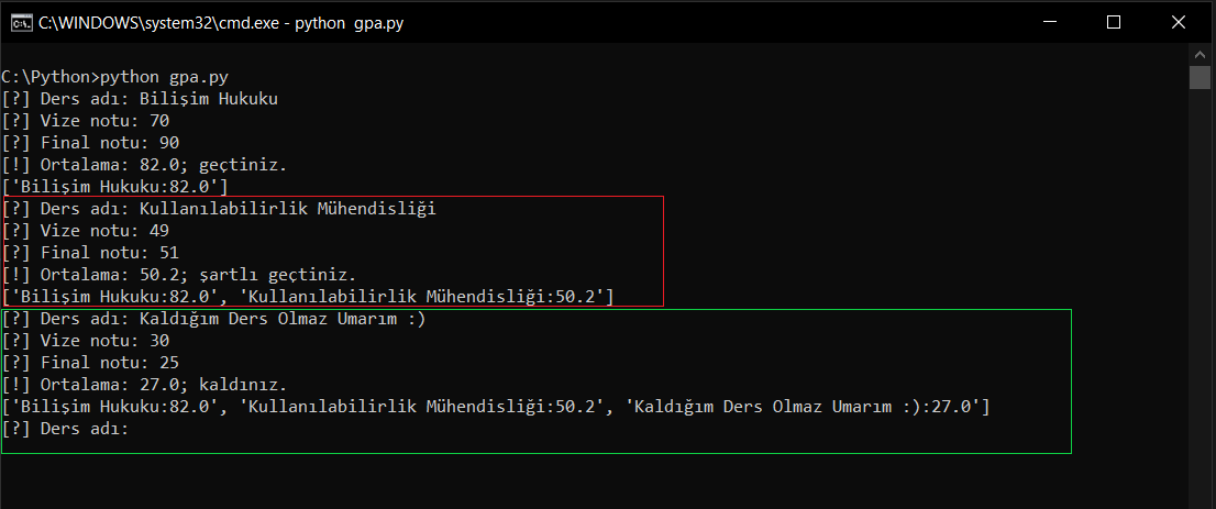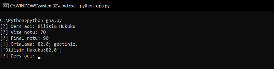 Gördüğünüz üzere ortalamam 82.0 olarak geldi ve dersten geçtiğimi söyledi. Bunun yanında bir alt satırda bunun bir listede tutulduğunu görüyorsunuz. Ayrıca dikkat edelim; while True: sayesinde program sonlanmadı ve benden yine bir ders ismi girmemi istiyor.