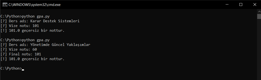Önce vize notunu sonra da final notunu yanlış girdim; kontrollerimiz ikisi için de güzel bir şekilde çalışıyor. Bunu if ile yapmadık; range ile yaptık.