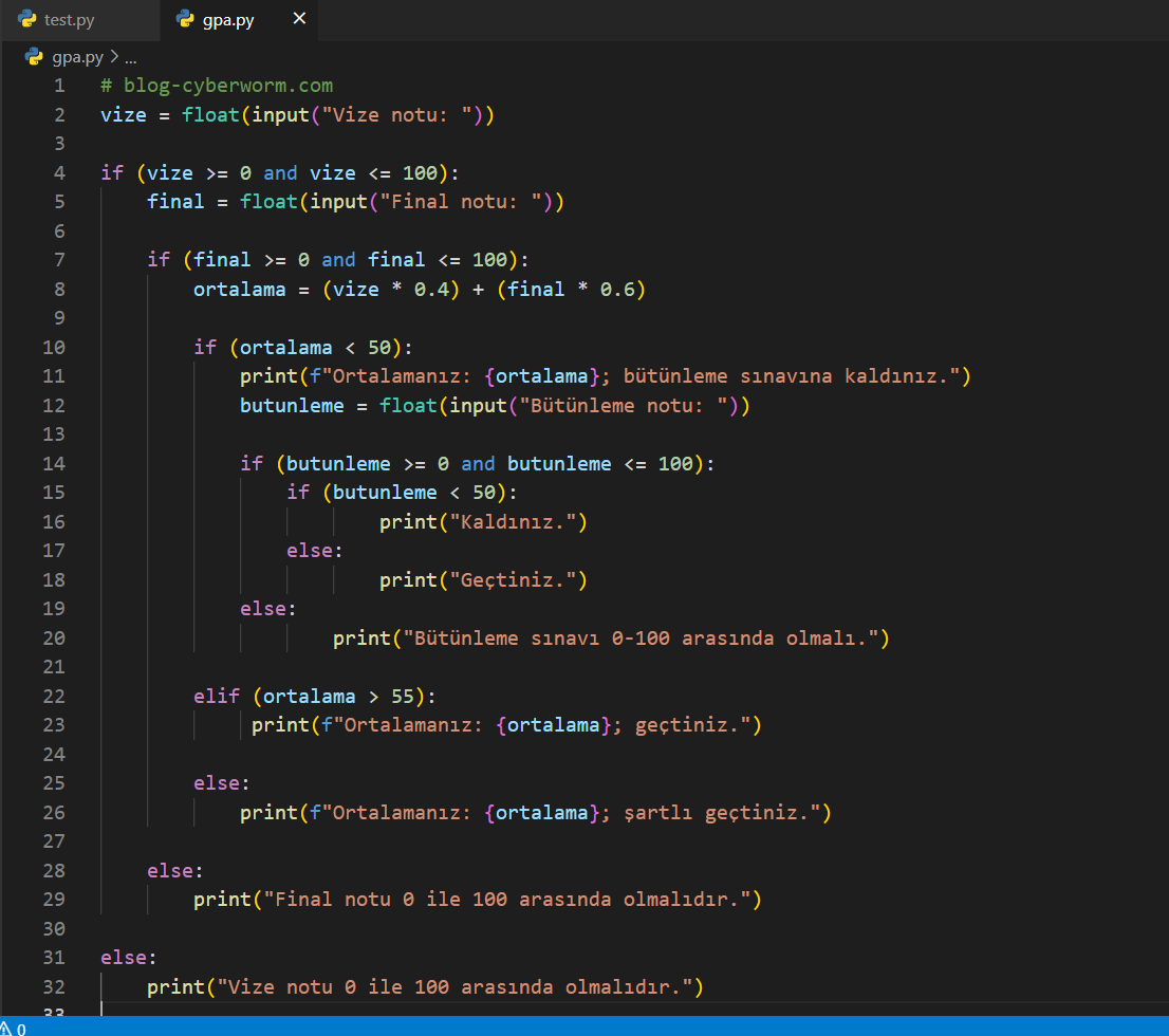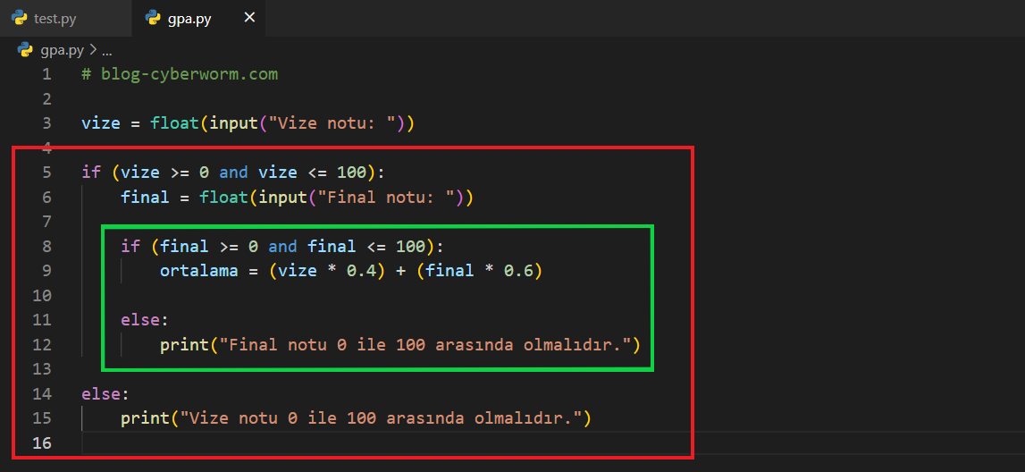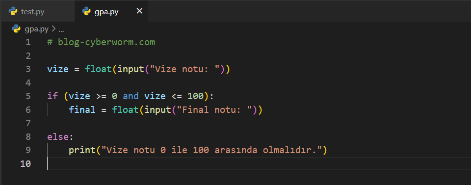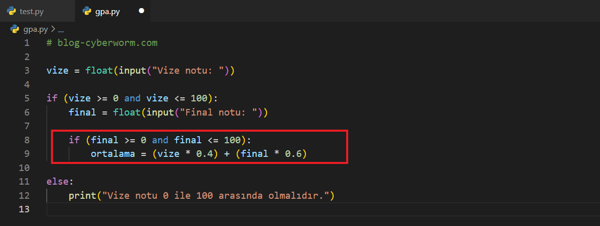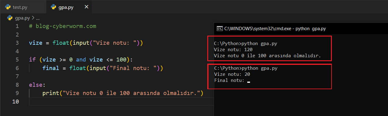 Gördüğünüz gibi 'vize >= 0 and vize <= 100' ifadesi ile bu kontrolü sağladım. Burada and operatörünü kullandığım için girilecek olan sayının 0 ile 100 arasında olması için kullanıcıyı zorluyorum. else kısmında ise bu kuralın ihlal edilmesi durumunda kullanıcıyı uyarıyorum. Dikkat ederseniz final notunu, kullanıcı eğer vize için 0 ile 100 arasında bir sayı girerse istiyorum. Eğer kullanıcı 0 ile 100 arasında bir sayı girmezse final notu da istenmeyecektir. Burayı denemekte yarar var:
