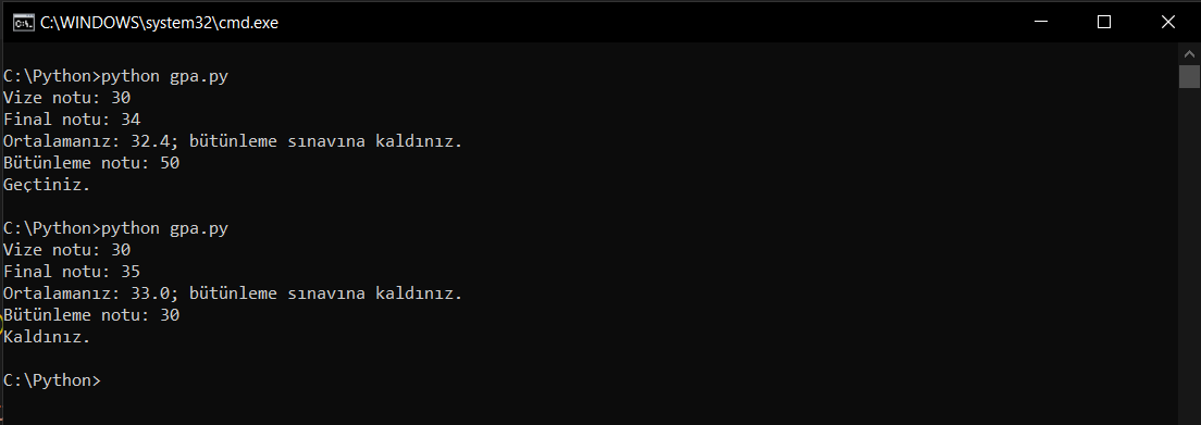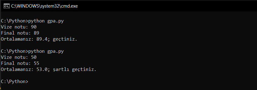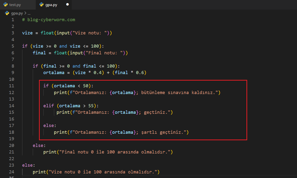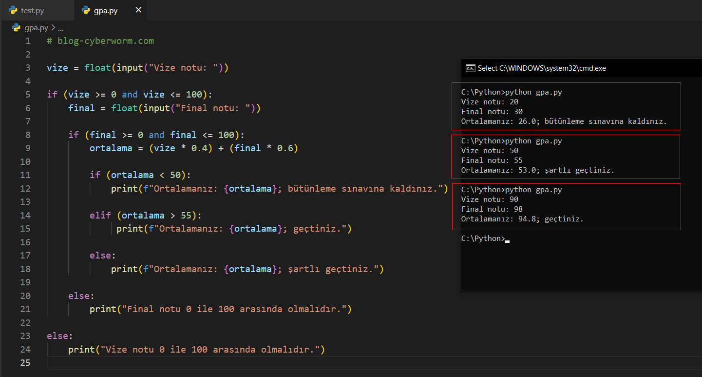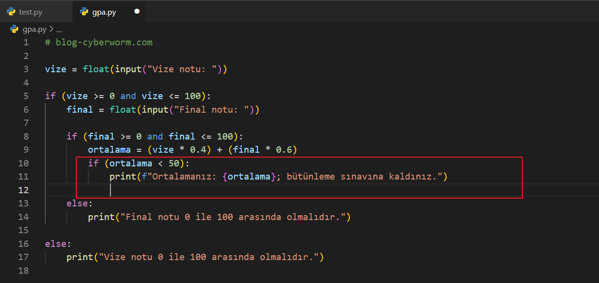 Gördüğünüz gibi 'vize >= 0 and vize <= 100' ifadesi ile bu kontrolü sağladım. Burada and operatörünü kullandığım için girilecek olan sayının 0 ile 100 arasında olması için kullanıcıyı zorluyorum. else kısmında ise bu kuralın ihlal edilmesi durumunda kullanıcıyı uyarıyorum. Dikkat ederseniz final notunu, kullanıcı eğer vize için 0 ile 100 arasında bir sayı girerse istiyorum. Eğer kullanıcı 0 ile 100 arasında bir sayı girmezse final notu da istenmeyecektir. Burayı denemekte yarar var: