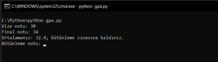 'ortalama' değişkeninin değerinin 50'den düşük olması durumunda öğrenci bütünleme sınavına giriyordu. O yüzden, bu durumu ona print ile belirttik. Tam bu noktada kullanıcıdan bütünleme sınavına dair bir puan almamız lazım. Bunun için butunleme = float(input("Bütünleme notu: ")) şeklinde bir kod yazıyorum.