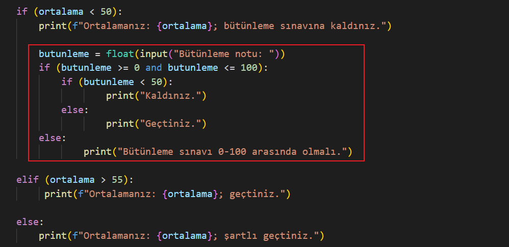 Girinti sistemine dikkat edin çünkü işler birazdan karışacak. Bu noktada kırmızı kutu, kodun genelini oluşturan bir if - else yapısıdır. Yeşil kutudaki if - else yapısı ise, kırmızı kutudaki if koşulunun çalışması durumunda devreye girecektir.