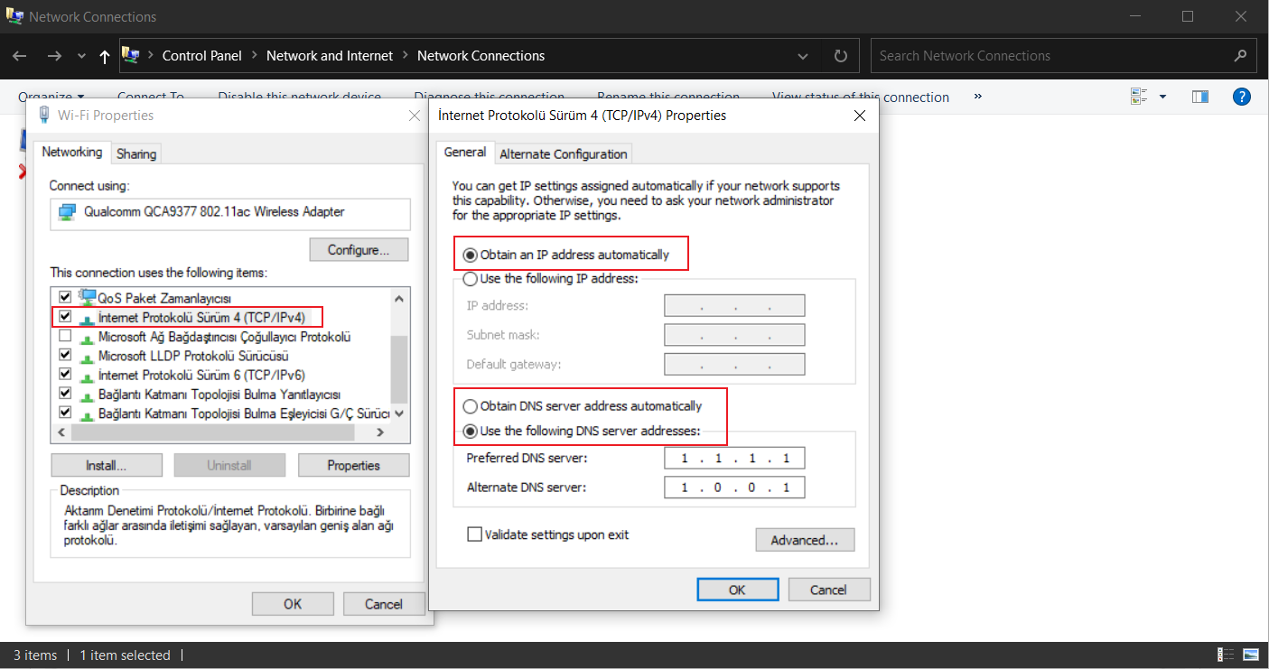Bu ekranı hatırlarsınız. Sol taraftan TCP/IPv4'e çift tıkladıktan sonra sağdaki pencere açılacaktır. Burada üst tarafta 'Obtain an IP address automatically' yani 'Otomatik olarak IP adresi al' seçeneğini seçerseniz DHCP yardımıyla size otomatik bir IP adresi tanımlanacaktır. DNS blogumuzda DNS adresimizi değiştirmeyi öğrenmiştik ama DNS adresinizin de DHCP ile otomatik olarak verilmesini isterseniz yine aynı şekilde o seçeneği işaretleyebilirsiniz.