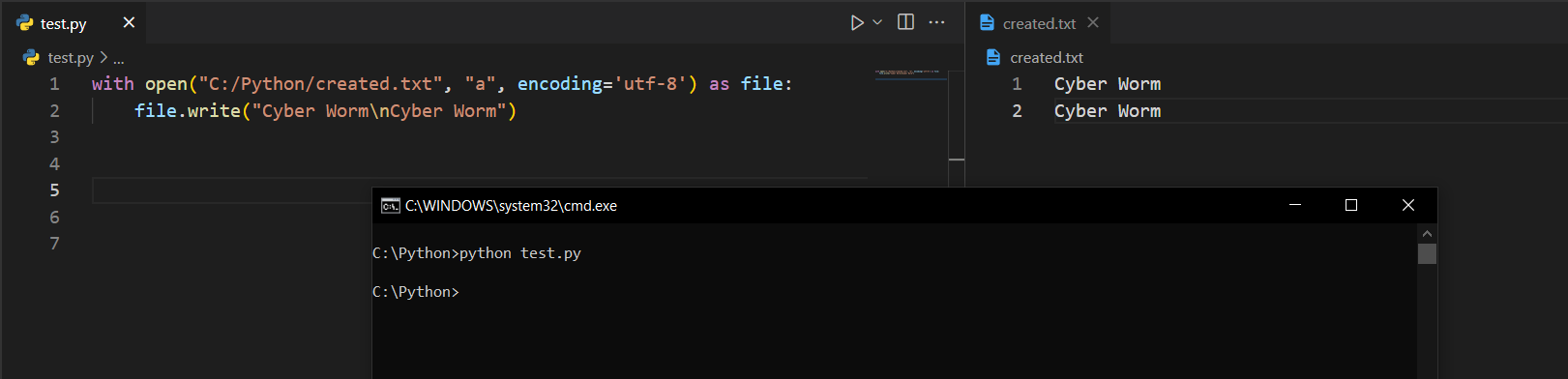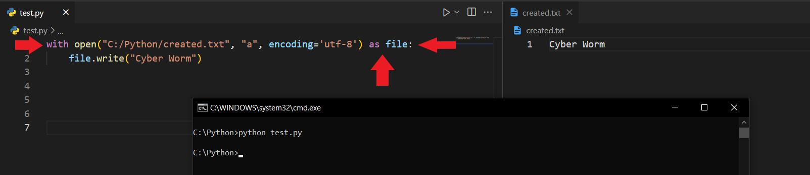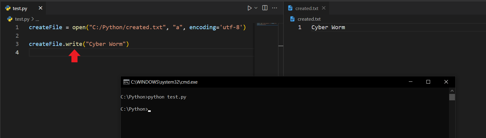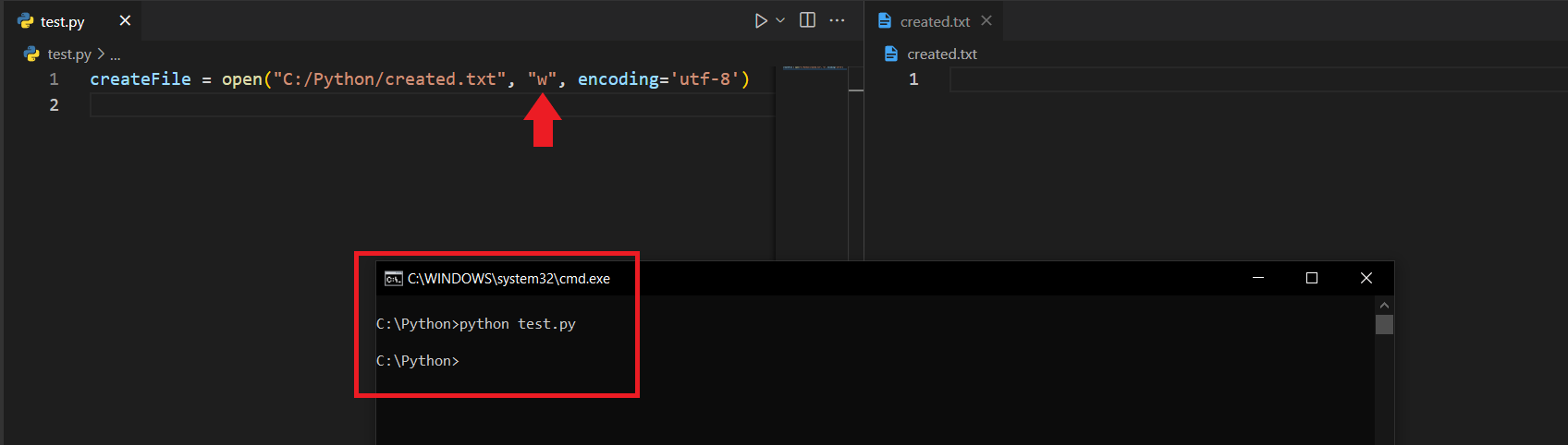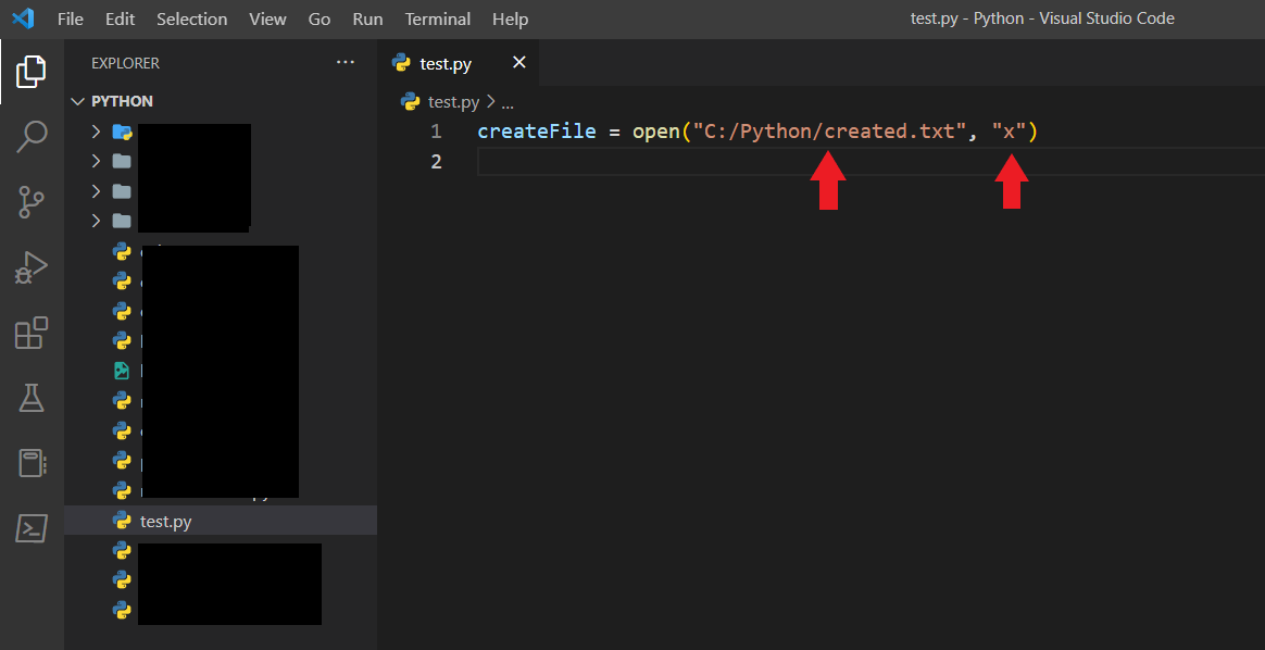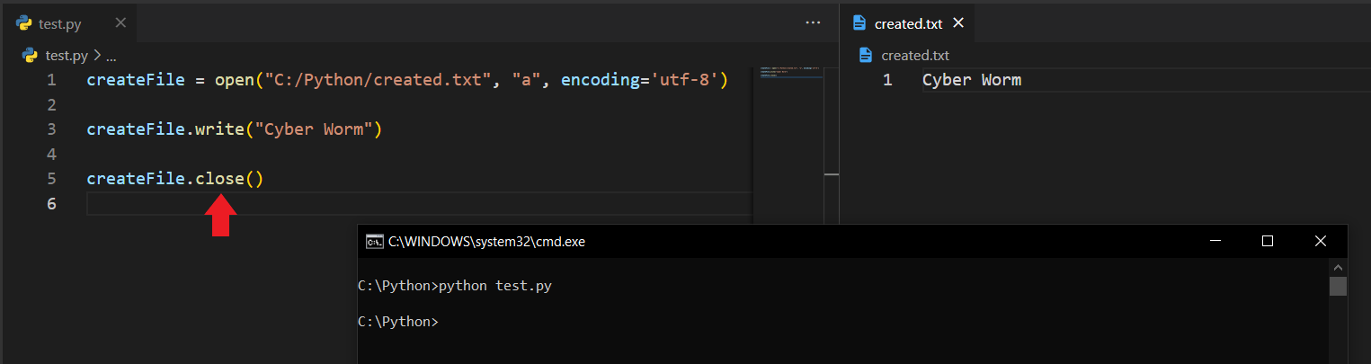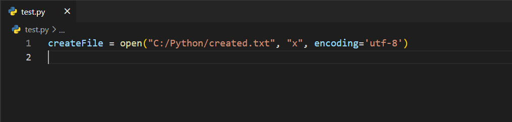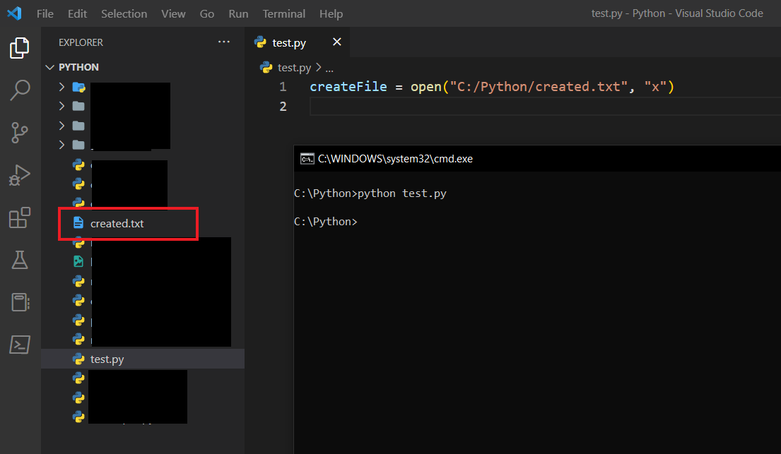 Koda baktığımızda open() fonksiyonunu çağırdığımı ve içerisine ilk önce lokasyonu, sonra da "x" şeklinde bir ifade verdiğimi görüyorsunuz. Buradaki "x", execute anlamını taşır ve dosya oluşturmamıza olanak tanır. Bu fonksiyon ve verdiğim parametreler sayesinde Python, C:/Python klasörü altına created.txt isimli bir dosya oluşturacaktır.