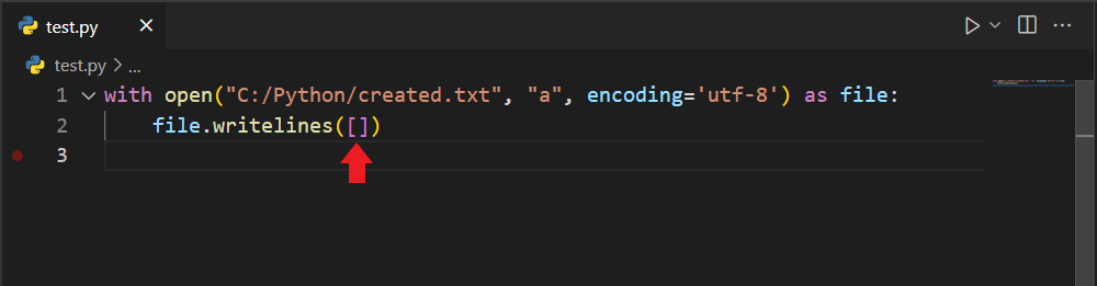 with open() yapısı ile created.txt dosyasını açıyorum. Sonrasında file.writelines() diyorum ve parantezler arasına bir liste açıyorum. Yani yapı bu şekilde oluyor: writelines([]). Devam edelim.
