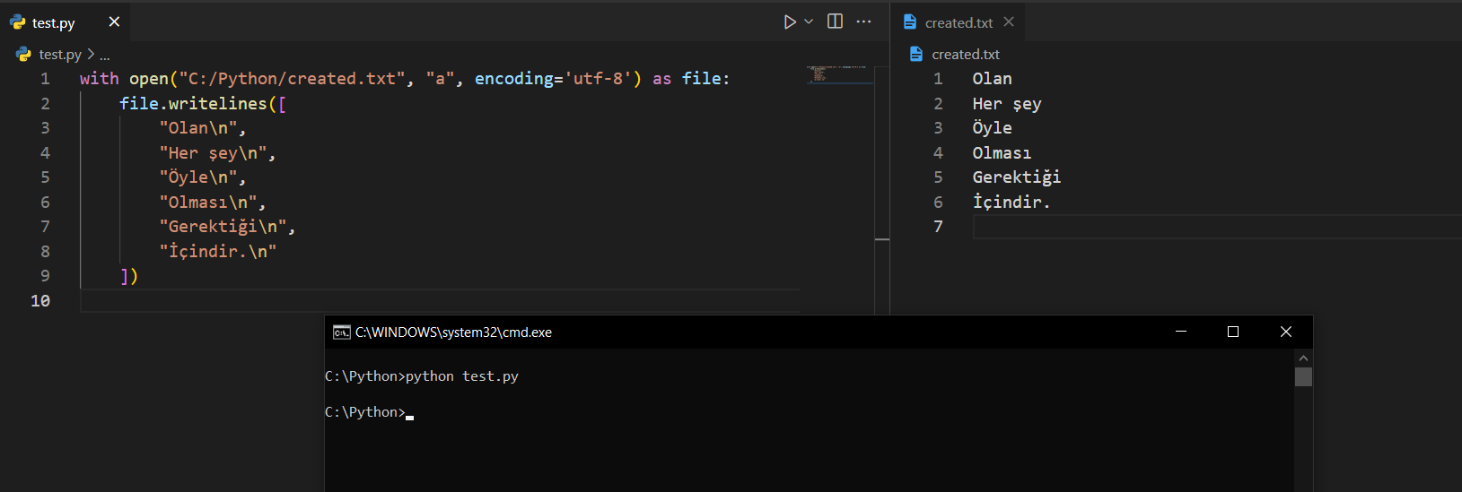 writelines() Fonksiyonuwrite() fonksiyonu, çok satırlı ve uzun metinler için çok da elverişli bir fonksiyon değildir. O, daha çok tek satırlık basit cümleler için daha kullanışlıdır. Peki, bir dosyanın için uzun bir metin yazmak istersek bunu da write() fonksiyonu ve '\n' özel kaçış karakteriyle mi yapacağız? Bu, okunabilir kod yapısına aykırıdır. Bu yüzden çok satırlı ve uzun metinler için writelines() fonksiyonunu kullanıyoruz. Bakalım.