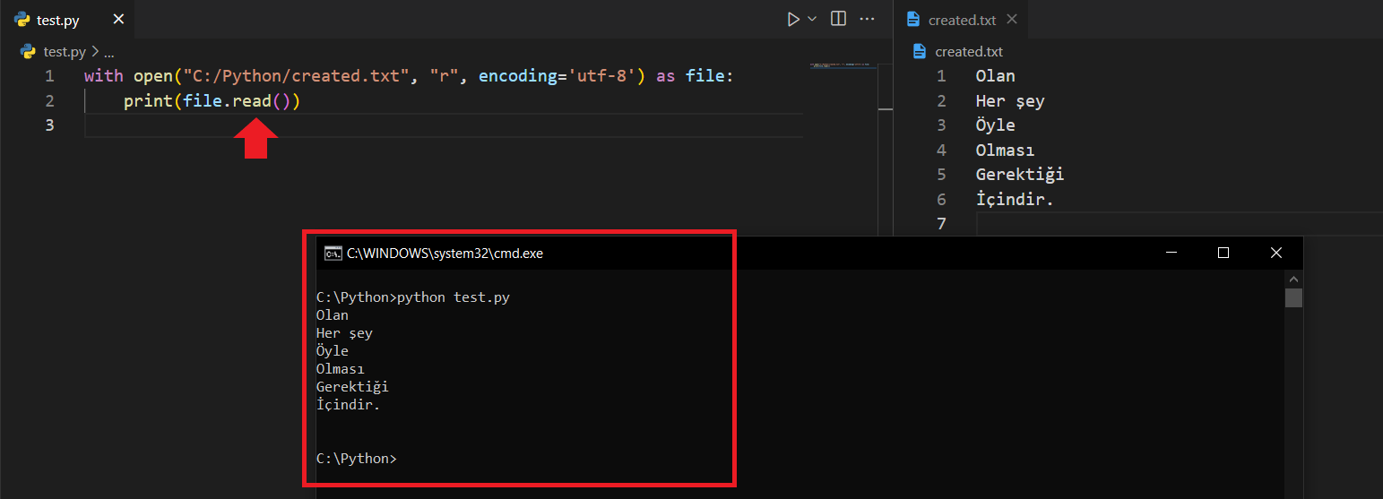 read() FonksiyonuBu fonksiyon, oluşturduğunuz ya da hâlihazırda var olan bir dosyanın içeriğini okumanıza olanak tanır. Görelim.