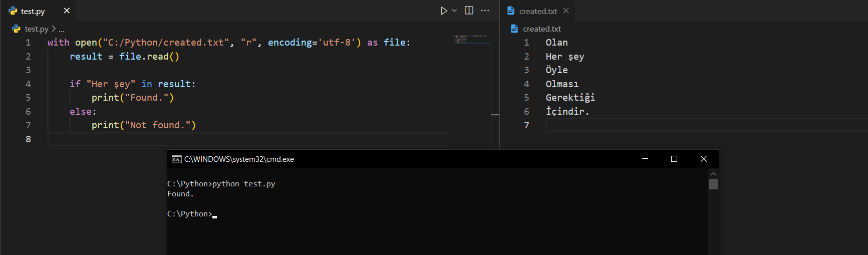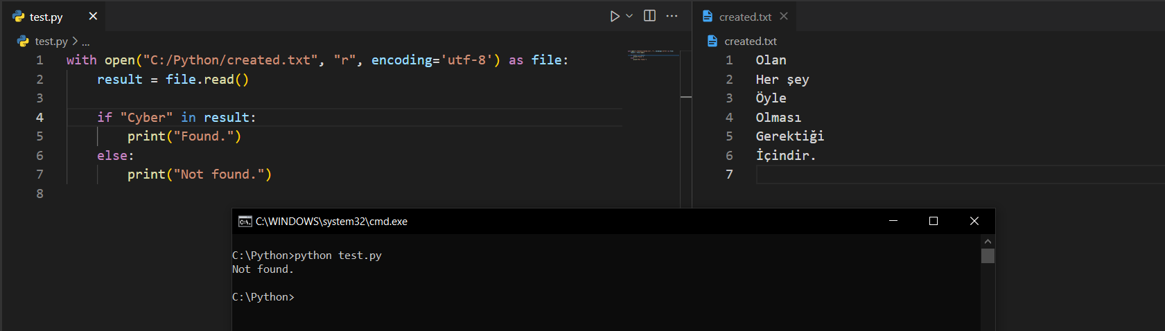 Yukarıdaki görselde değişken içerisinde yani aslında dosya içerisinde "Her şey" kalıbını aradık; sonucu inceleyebilirsiniz. Bir de dosyada yazmayan bir şeyi arayalım.