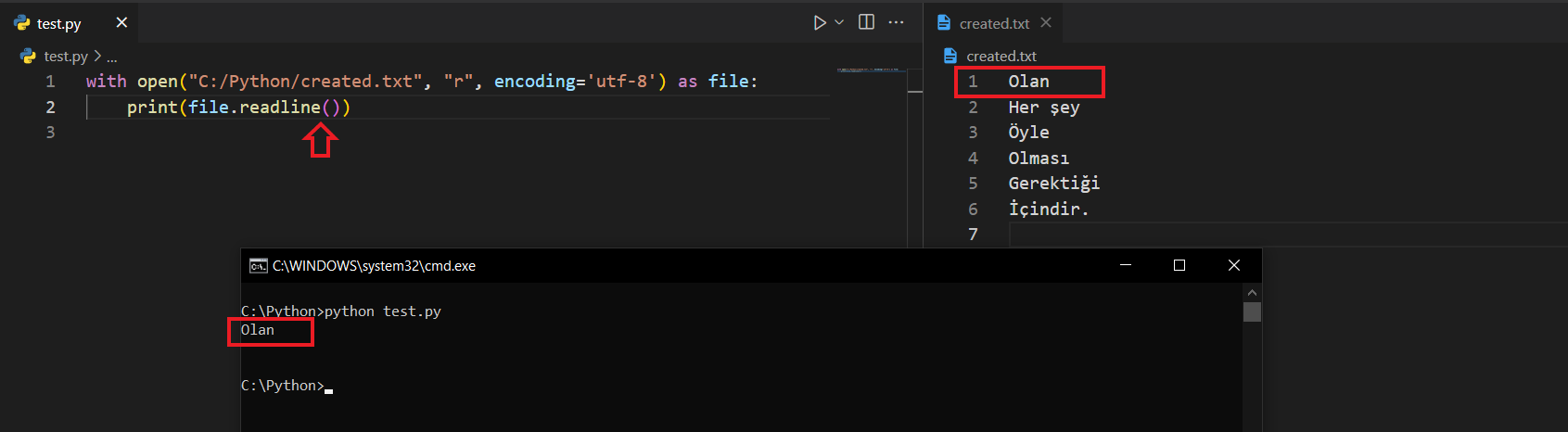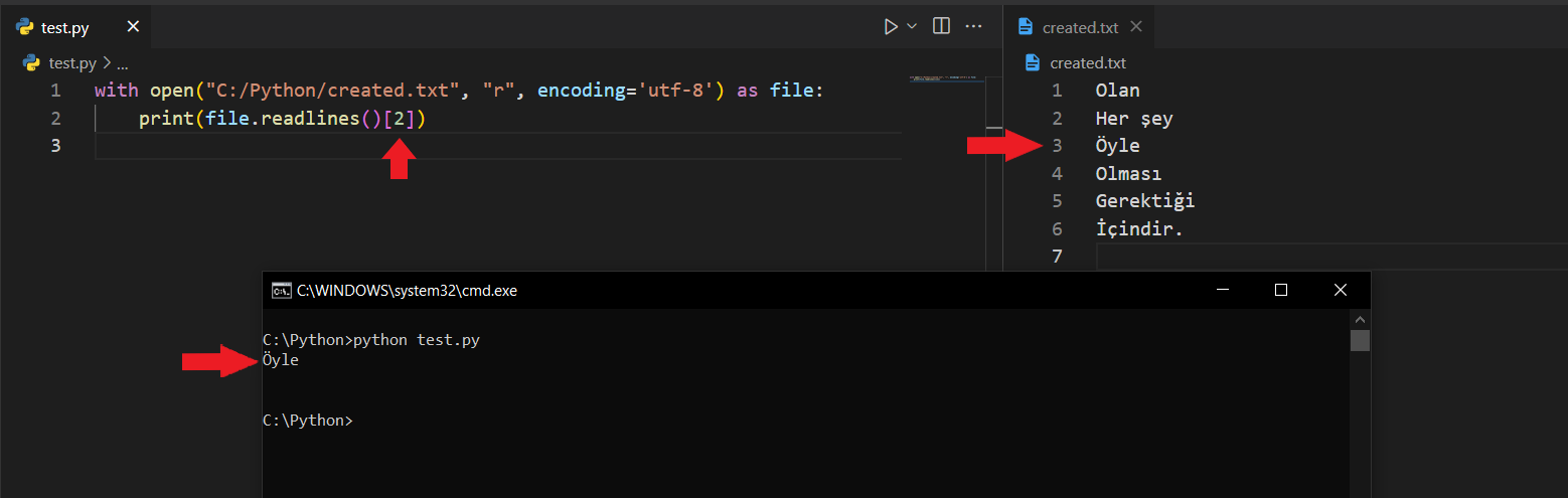 readlines() FonksiyonuBu fonksiyon ise read() fonksiyonu gibi bütün dosyayı okur ama bunu bir liste olarak geri döndürür. Bakalım.