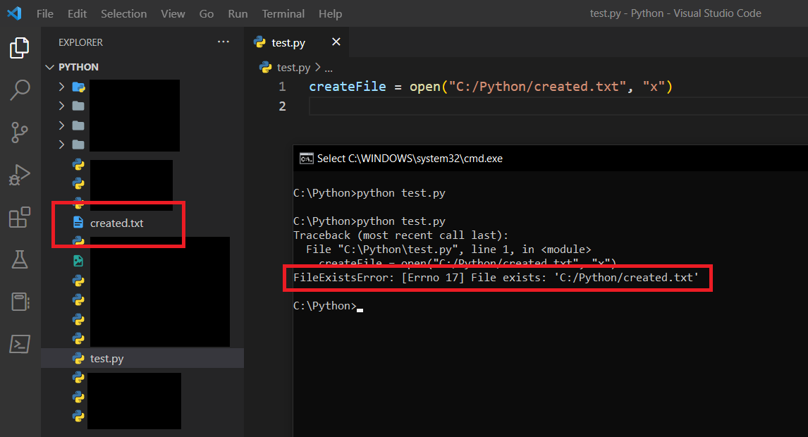 Kodu çalıştırdığımda gerçekten de created.txt isimli bir dosyanın geldiğini görebiliyoruz. Yani dosya oluşturma işlemimiz gayet başarılı oldu. Peki, eğer bunu tekrar çalıştırmaya kalkarsanız ne olur?