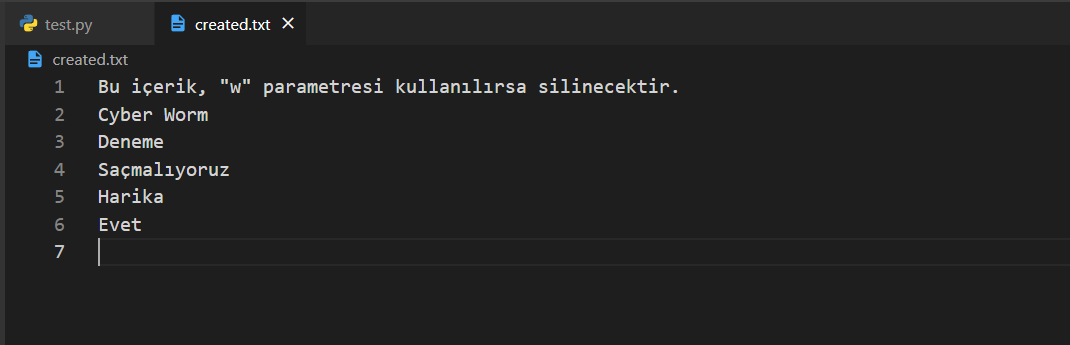 Gördüğünüz gibi programı çalıştırır çalıştırmaz created.txt içerisindeki yazılar silindi. Dolayısıyla "w" parametresini kullanacaksanız çok dikkatli olmak zorundasınız.