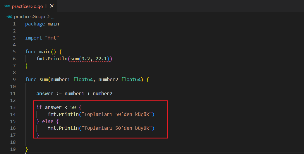 Bunların yanında; return ifadesinden sonra herhangi bir şey de yapamıyoruz. 'return' en sonda kullanılması gereken bir komuttur. Dikkat ederseniz 'fmt.Println()' kullandık ve Go, bize buunu yapamayacağını belirtti. Çünkü zaten bir değer döndürüyoruz; fmt'ye gerek yoktur.