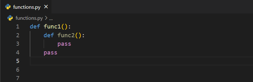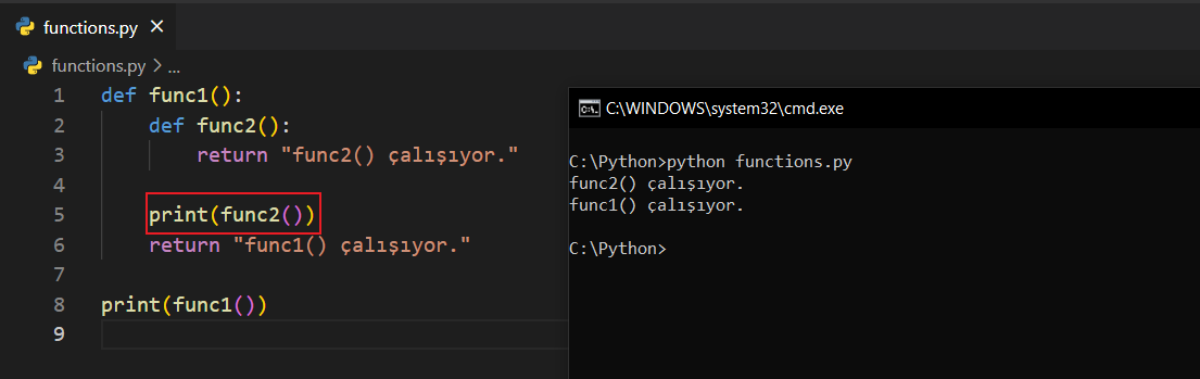 Gördüğünüz üzere def func1() dedikten sonra func1() fonksiyonunun içerisine girip func2() isminde yeni bir fonksiyon daha tanımladım. Bu noktada girinti sistemine dikkat ederseniz her şey sizin için daha kolay olacaktır.
