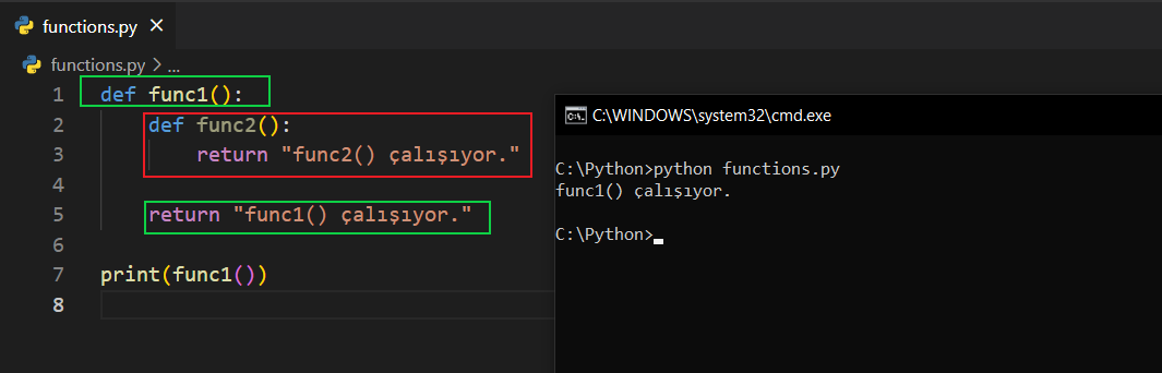 func2() fonksiyonunu dışarıda çalıştırırsak altı çizilecek ve bize NameError hatası verecektir. Diyor ki: "func2 tanımlı değil". O zaman ben bunu func1() fonksiyonunun içinde olacak şekilde çalıştırırsam sorun olmaması gerekiyor. Bakalım.