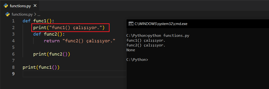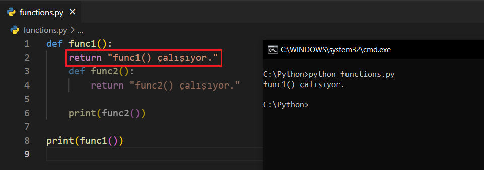 Dikkat ederseniz print() yerine return kullandım ve return ifadesinin altındaki kodlar silikleşti. Ayrıca çıktı kısmında da yalnızca func1()'e ait return ifadesinin çalıştığını görüyorsunuz. Hatırlayacağınız üzere return ifadelerinden sonra gelen kodlar çalışmıyordu.