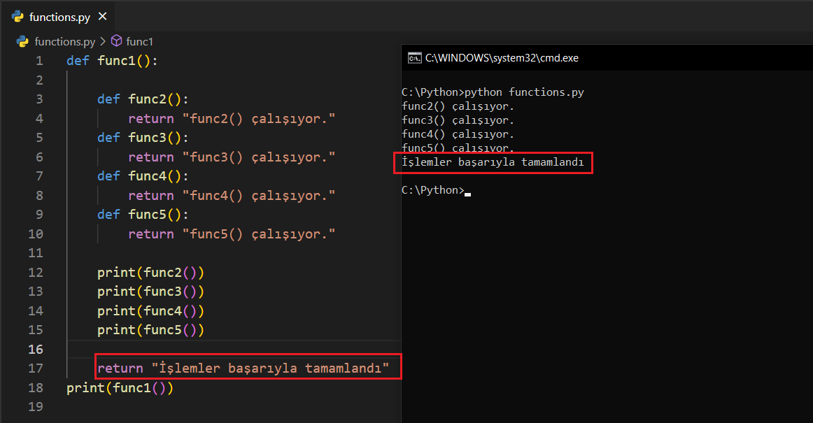 Bu şekilde bir işlem yapmak mümkündür. Ancak ana fonksiyonumuz olan func1() None değer döndürdü. Bu, return kullanmadığımız için oldu. Yalnız, dikkatli olalım; eğer return ifadesini başa koyarsanız sonrasında kodlarını çalışmaz. Örneğin;