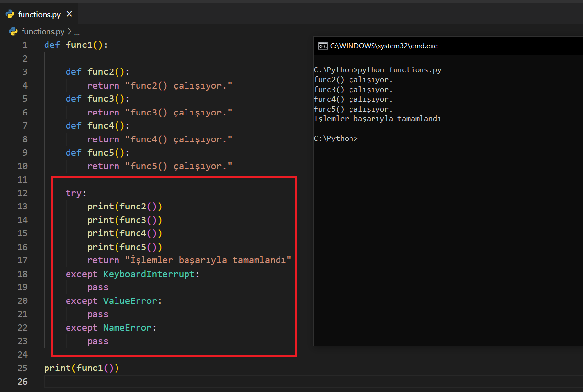 Dikkat ederseniz ana fonksiyon dışındaki her fonksiyonu try: ile denedim. Zaten try: içerisinde hata almazsak except bloklarına hiç girmeyecektir; kodumuz başarılı olmuştur. Bu yüzden try: dedikten ve komutları verdikten sonra return diyebilirsiniz. Eğer bir hata yakalanırsa zaten except bloklarına gireceği için return ifadesi çalışmayacaktır.