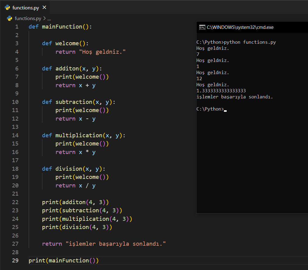 Kodu inceleyebilirsiniz. Bu kod içerisinde hem iç içe fonksiyon tanımlamayı, hem de iç içe fonksiyonların içinde başka bir fonksiyonu çağırmayı göreceksiniz.