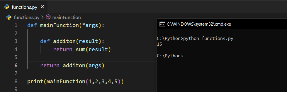 mainFunction isimli fonksiyona *args argümanını verdim. Fonksiyonun içerisine de toplama işlemi yapan bir fonksiyon yazdım ama aldığı argüman result. Buradaki result, args ile ilişkisi olan ve toplama işleminin saklanacağı değişkendir. addition() fonksiyonunun dışına çıkıp return addition(args) diyerek addition() fonksiyonunun sonucunu döndürdüm.