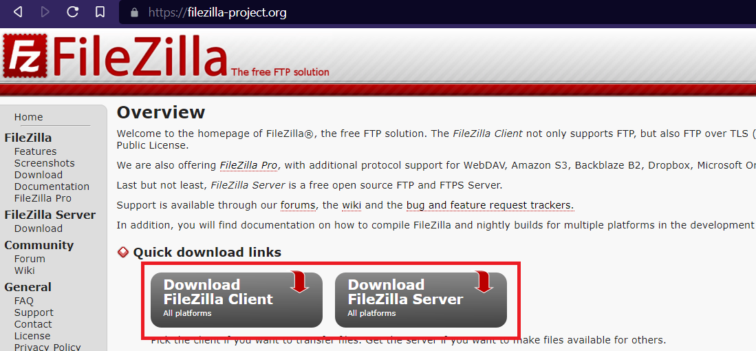 Türkçe'ye 'Dosya Transfer Protokolü' olarak çevrilebilir ve geliştirilen ilk internet protokollerinden biridir; yani değerlidir. FTP, adından da anlayabileceğiniz üzere iki bilgisayar arasında dosya transferini sağlayan protokoldür. Bunun için elbette iki bilgisayar arasında etkileşimli bir bağlantı kurulur. Bunu yaparken daha önce anlattığımız 'Client - Server' yani 'İstemci - Sunucu' modeline göre çalışır. Buna bağlı olarak şöyle bir çıkarım yapabiliriz: "Bilgisayarlardan birinde bir FTP sunucusu olmalıdır yani bilgisayar, sunucu görevi görmelidir. Diğer bilgisayar ise istemci olmalıdır." Buradaki 'istemcinin' bir istekte bulunabilmesi için tabii ki çeşitli yollar mevcuttur. Örneğin bir kullanıcı arayüzüne sahip olan FileZilla gibi programlar veya bildiğiniz Komut İstemcisi (cmd - Terminal) sayesinde bu istekleri başarılı bir şekilde gönderebiliyoruz. Fakat tabii ki bunun için gerekli bilgileri (kullanıcı adı ve parola gibi) bilmemiz gerekir. Bu arada FileZilla gibi programları hem istemci hem de sunucu olarak kullanabiliyoruz. Aşağıda, FileZilla'nın resmi web sitesinde bulunan indirme seçeneklerine bakabiliriz.