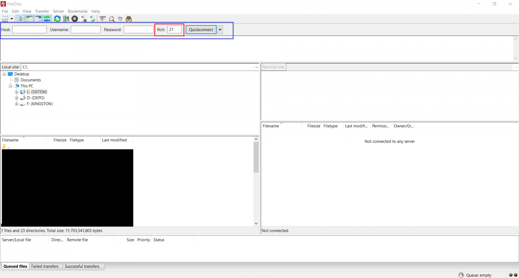 Yukarıda gördüğünüz, FileZilla'nın arayüzüdür. Ben Client için olanı indirmiştim. Şimdi, lacivert kutu içerisine aldığım bölgeye bakın. Oradaki bilgiler, bağlanacağınız FTP sunucusunun bilgileridir. Kırmızı kutucuk içerisinde de port numaramız, 21 olarak geçiyor. Dolayısıyla kısaca; "FTP, 21 numaralı portu kullanarak istemci - sunucu modelinde çalışan bir dosya transfer protokolüdür." diyebiliriz.