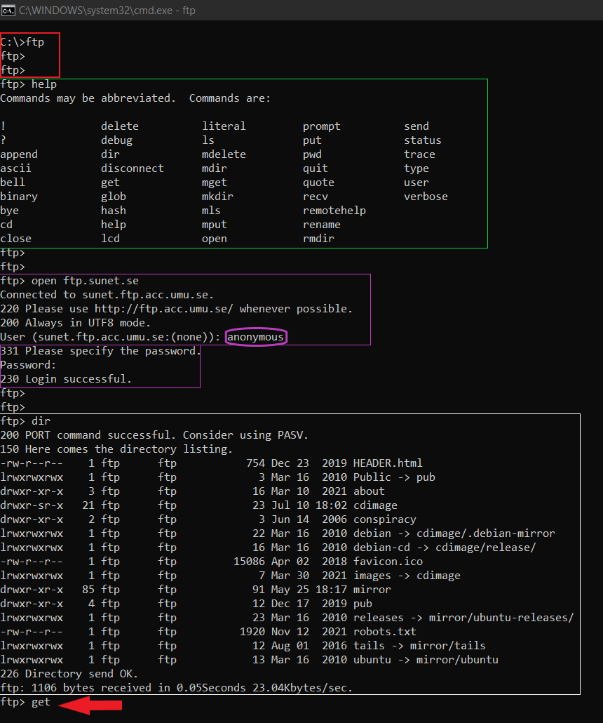 İşte, FTP bağlantıları bu şekilde gerçekleştirilebiliyor. Geri kalan komutlar hakkında bilgi sahibi olmak isterseniz kendi araştırmanızı yapabilirsiniz.