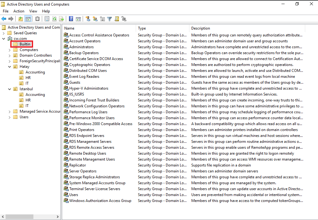 Evet, yetkisi güçlü ve büyük gruplarımız "Builtin" OU'su altında bekliyor. Buradakilerin ne olduğunu ezberlemenize gerek yok, zaten her grubun karşısında o grubun ne işe yaradığı hakkında bir açıklama mevcut. Örneğin;