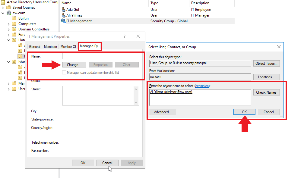 Yine aynı alandan "Managed By" kısmına geliyoruz ve orada bulunan "Change" butonuna tıklıyoruz. Burada, az önce pratiğini yaptığımız alan tekrar gelecektir. Ali Yılmaz'ı biraz önce gösterdiğim şekilde buraya ekleyip OK diyoruz.