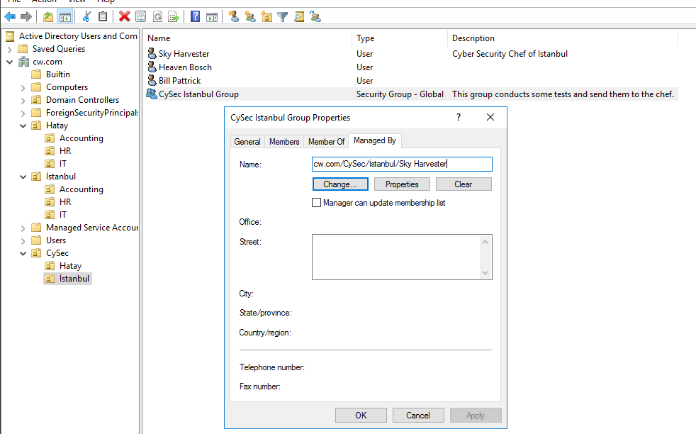 Hatay CySec OU'su için üç adet üye oluşturdum ve cyber worm adındaki üyeyi yönetici yaptım. Şimdi benzer bir işlemi İstanbul için yapalım.