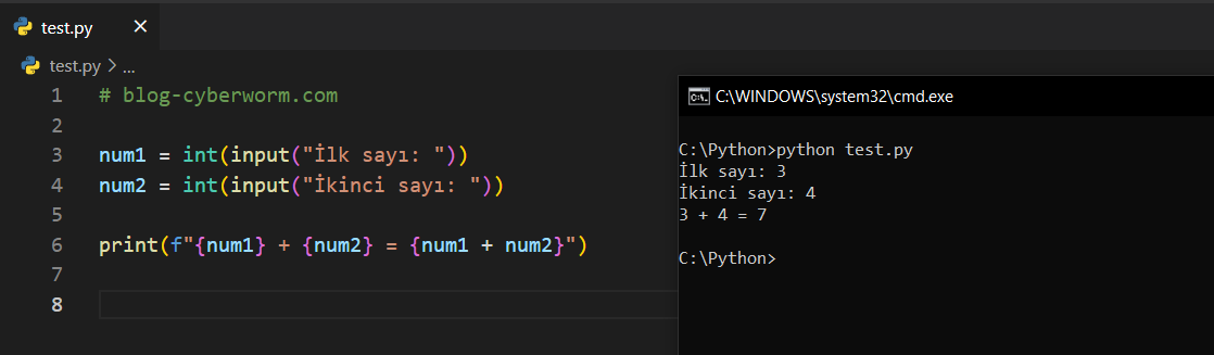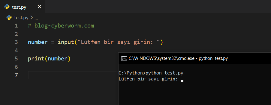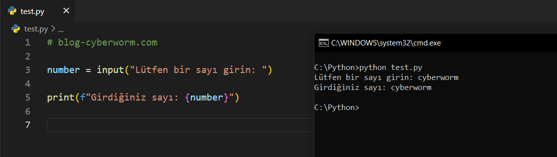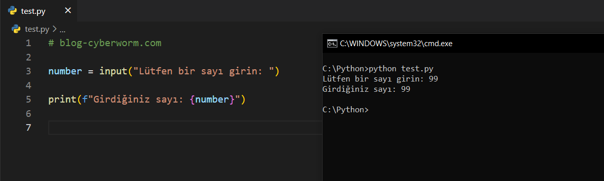 Ayrıca dikkat edelim; print("Lütfen bir sayı giriniz: ") ifadesi ile input("Lütfen bir sayı giriniz: ") ifadesi benziyor. print içerisinde ifadeler, ekrana sadece yazı yazdırmak içindir. Ancak input içerisindeki ifadeler, kullanıcının ne girmesi gerektiğini anlaması içindir. İlk ekran görüntüsünde sadece 'input()' yazmıştık ve bizden bir şeyler girmemiz beklendi. Ancak bizi, sadece siyah bir ekran karşılamıştı ve bu yüzden ne gireceğimizi bilemedik. Bu noktada input içerisine bir metin verdiğimizde kullanıcı, ne girmesi gerektiğini anlayacaktır. print ve input fonksiyonlarına verilen metinlerin farkı bu şekilde.