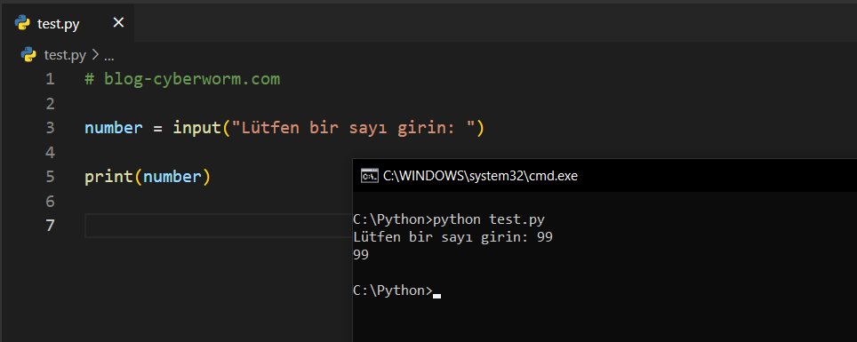 Hemen sonrasında print(number) şeklinde bir kod yazmışım. Bunun anlamını zaten biliyorsunuzdur. Burada kullanıcı, 99 değerini girdiğinde aslında number = 99 şeklinde bir tanımlama gerçekleşmiş oluyor. Bu tanımlama sonrasında print(number) dediğimizde aslında 99 değerini yazdırması gerektiğini anlıyoruz.